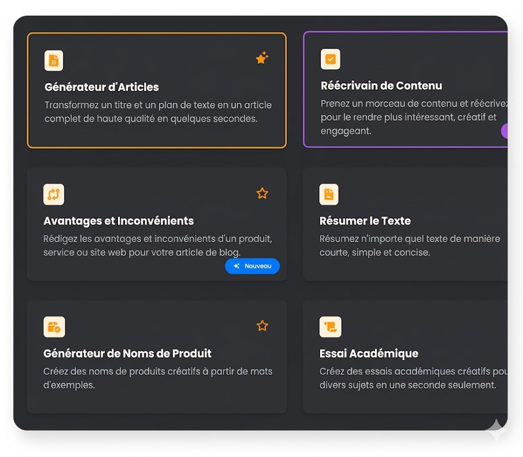 Choisissez parmi une large gamme d'outils d'IA pour écrire des publicités sur les réseaux sociaux, des sections de héros, des articles de blog, des essais, etc...