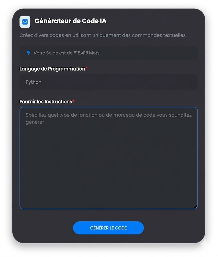 Générez des algorithmes complexes simplement en utilisant le langage naturel pour expliquer ce que vous recherchez, nous nous occuperons du reste pour vous. Écrivez du code comme Pro en Python, Flutter, PHP, JavaScript, Ruby et d'autres langages de programmation.